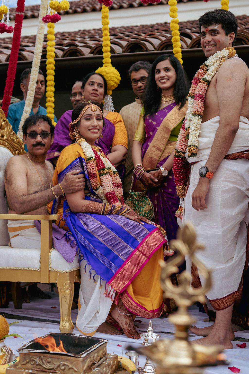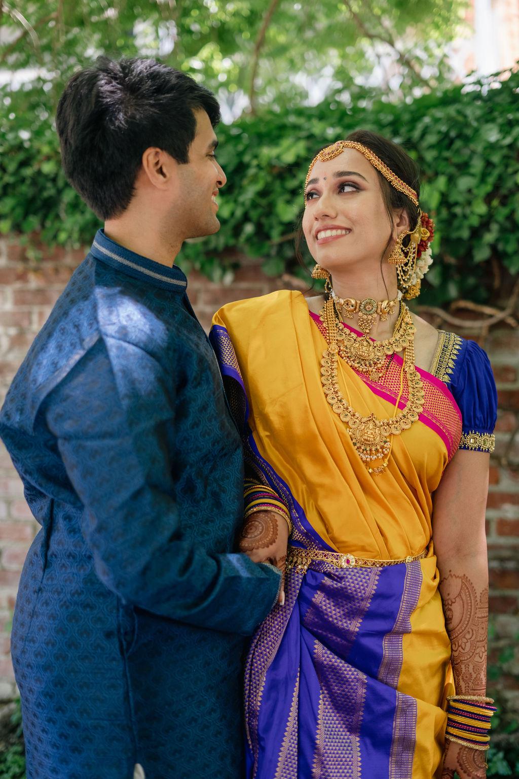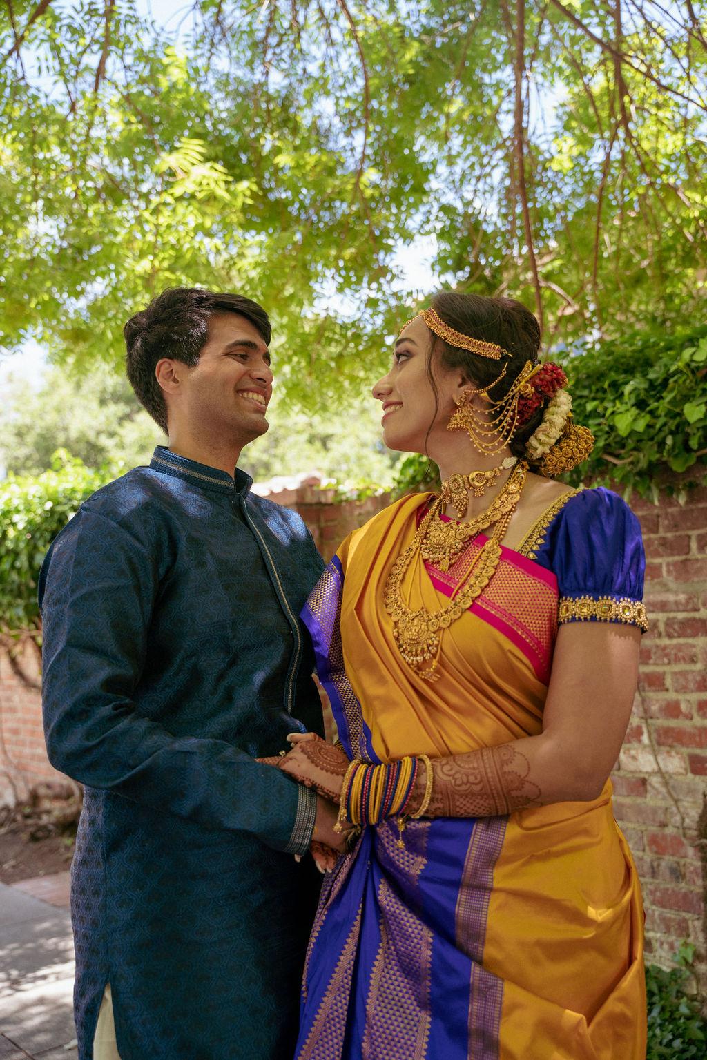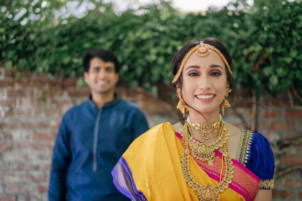 On the day of the Telugu wedding, Divya looked resplendent in her traditional saree, draped to perfection by Etiquette Draping. Her makeup and hair, expertly handled by Bridal Boutique by