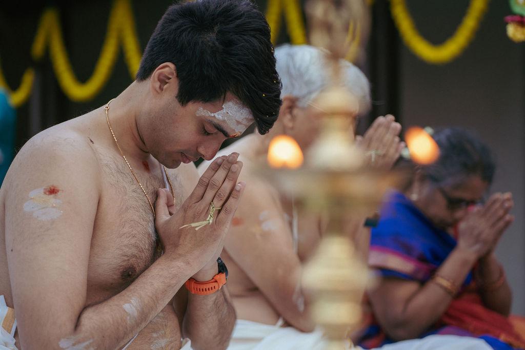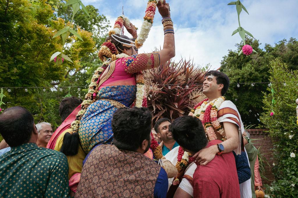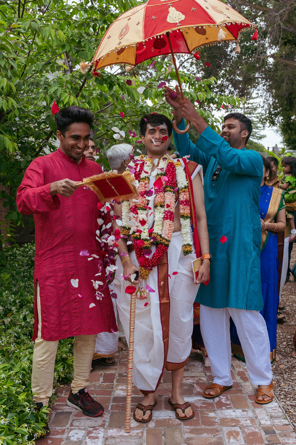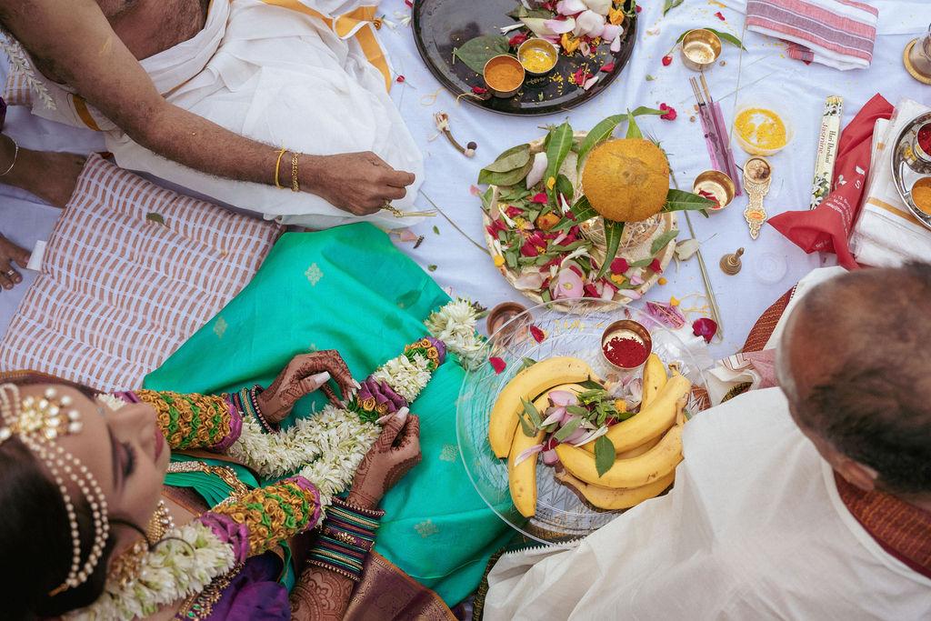 On the day of the Telugu wedding, Divya looked resplendent in her traditional saree, draped to perfection by Etiquette Draping. Her makeup and hair, expertly handled by Bridal Boutique by