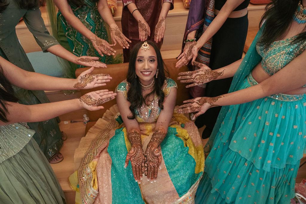 Raman Brar, highlighted her natural beauty. The intricate henna designs on her hands, courtesy of Henna Creationz, told a story of love and tradition.